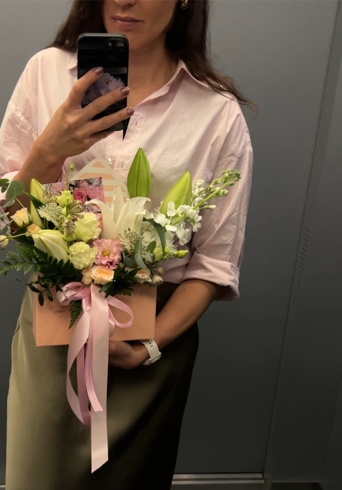 Ziedi aplokšnu kārbiņā-lilijas, sīkziedu neļķes, eiklipti. Vienmēr ērti un moderni!