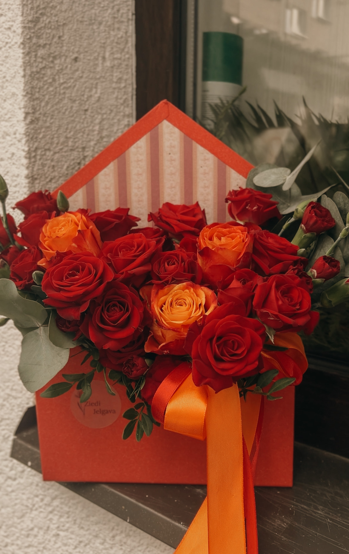 Koša, ar svētku sajūtām veidota ziedu kārbiņa iepriecinās ikvienu saņēmēju.