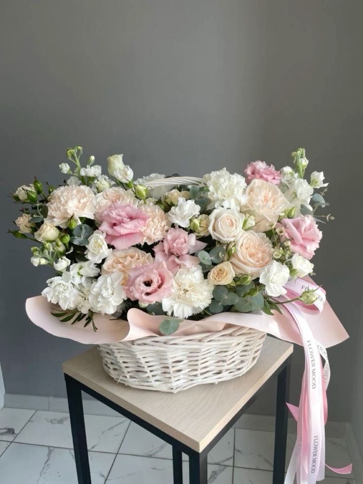 Ziedi īpašiem dzīves mirkļiem. Bagātīga ziedu kompozīcija grozā- rozes, krūmrozes, lizantes, vaska puķes, eikalipti.